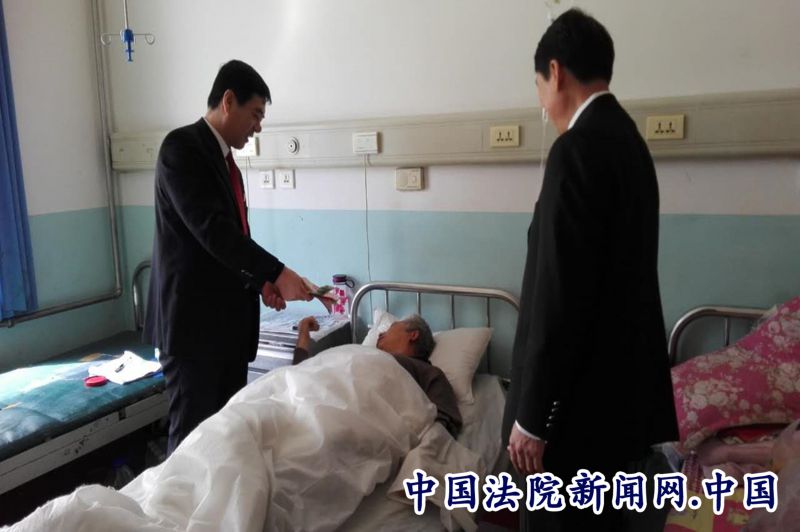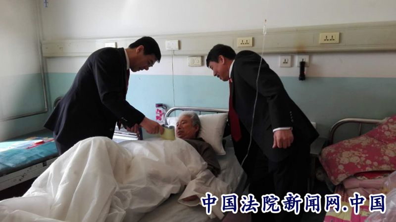 长白朝鲜族自治县人民法院干警坐在躺在病床上的金某两旁劝慰其配合医生治愈疾病场景。