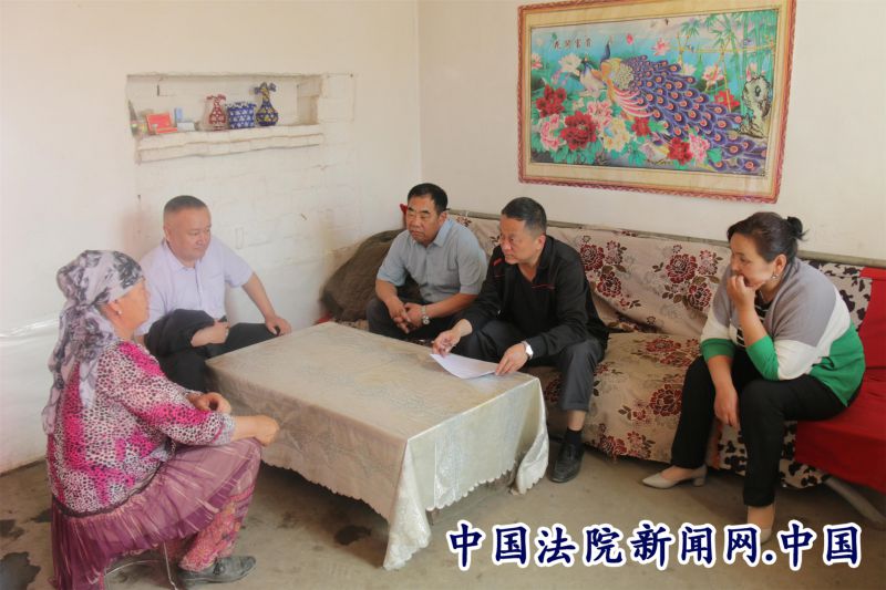 在村民叶尔巴合提家,宋恒明和达吾列•托列吾同志与叶尔巴合提亲切交谈,关心他家的生产生活,法院干警和其结对认亲情况,并向他们宣传了党中央、自治区党委、地委关于民生建设重要理念和民生改善带来实惠。