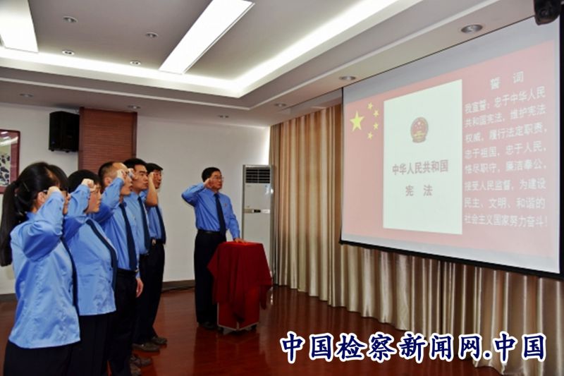 “我宣誓:忠于中华人民共和国宪法,维护宪法权威,履行法定职责,忠于祖国,忠于人民……”宪法图板前, 该院党组成员、政治处主任手抚宪法,擎起右拳,带领5名新晋法律职务的检察官齐诵誓词。几名检察官神情严肃,右手举拳,声音洪亮,以庄严的仪式告白对宪法的忠诚。铿锵恢宏的铮铮誓言激荡在每位检察官的心里,表达了大家对国家的忠诚、对人民的热爱、对宪法的尊崇和对职责的恪守。