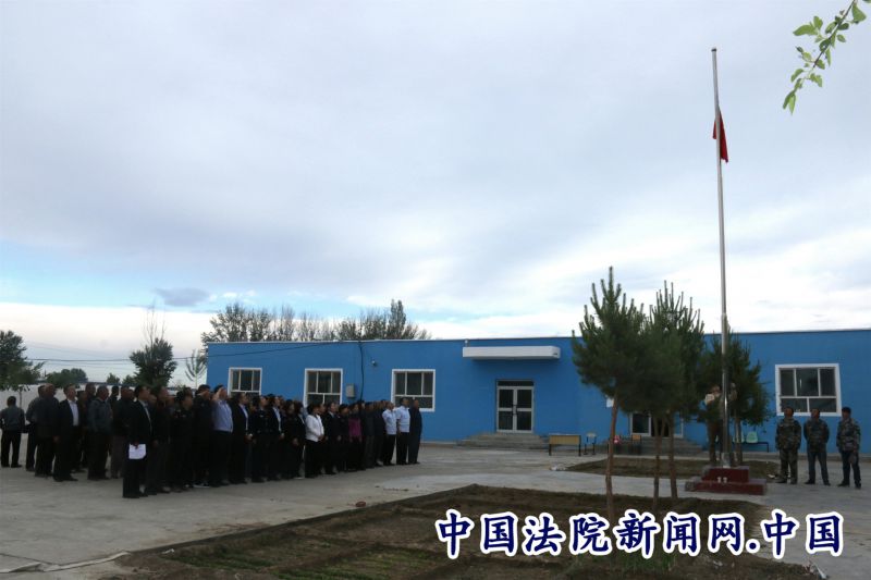 法院干警与农牧民一同升国旗。