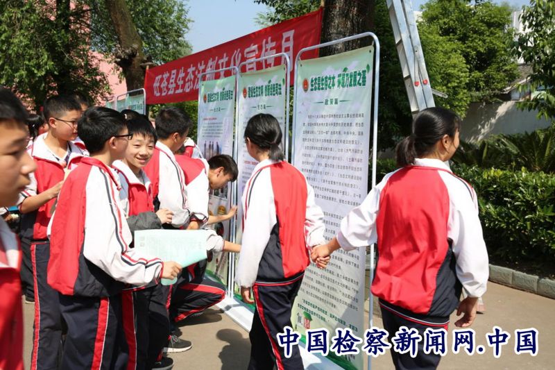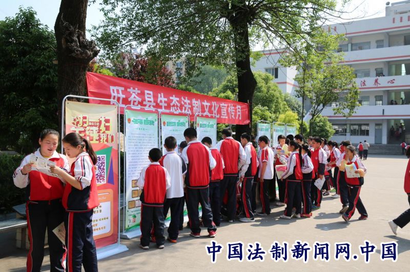旺苍县人民检察院的检察官带着本院的绿色文化——生态法治文化宣传,以图片展览的方式普及了保护生态环境的法律、政策,讲述了在本地影响较大的“毒鱼污染水源案”、“猎杀猕猴案”“贩卖黑熊案”“滥伐林木案”等案件,介绍了“生态补偿基地”、“谁砍树谁补植”等一系列举措。孩子们一边观看宣传海报,一边展开讨论,现场气氛十分热烈。