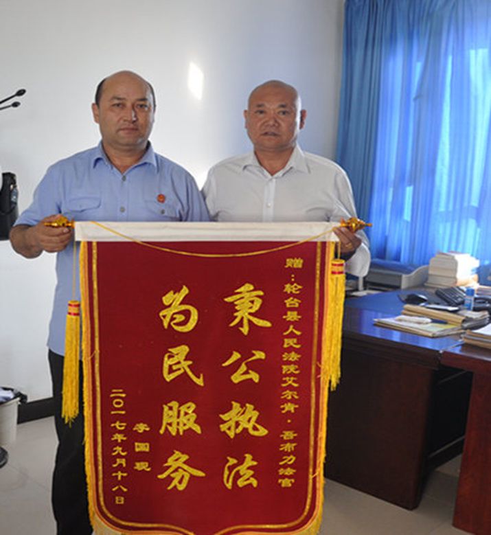 中国法院新闻讯(杜文清)“感谢轮台法院,感谢办案法官,多亏了你们我才能拿回这笔7万元的案款,整整四年,这笔钱我终于拿到手了!”9月21日,当事人李某将一面印有秉公执法、为民服务的锦旗送到轮台县人民法院办案法官艾尔肯•吾布力手上。