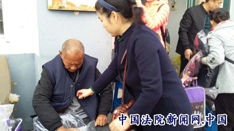 长白县法院组织党员为塔山社区老人捐款工作人员帮老人试穿服装场景