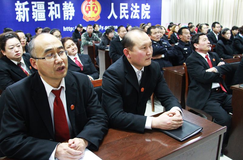 和静县人民法院党组书记解忠成说:“法官宣誓活动是一种庄重的仪式,表达了人民法官对宪法的尊崇和信仰。人民法官在忠于宪法、维护宪法权威的同时,要忠于祖国、忠于人民,恪尽职守、廉洁奉公,为建设富强、民主、文明、和谐、美丽的社会主义国家做出自己就有的贡献!”
