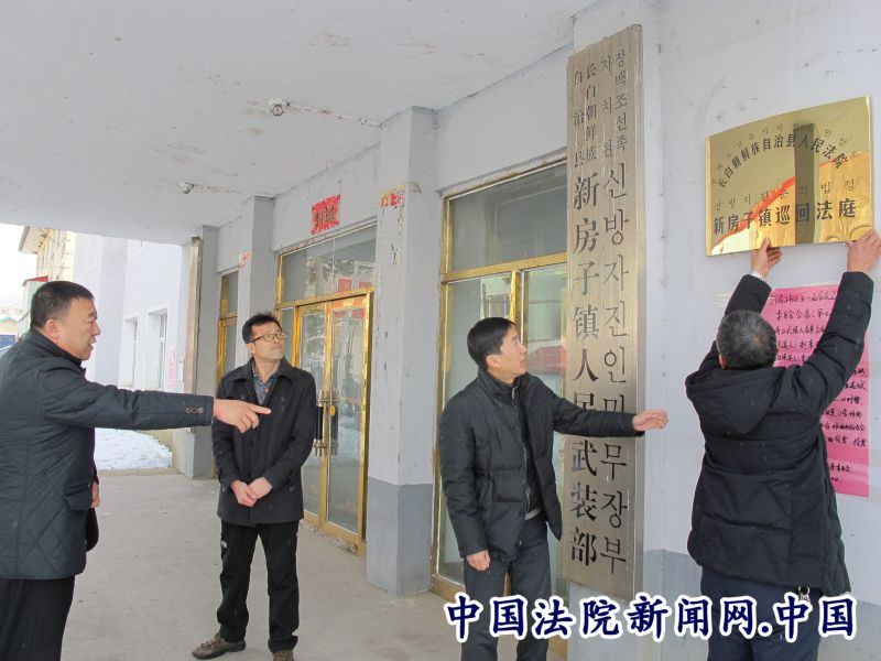 长白朝鲜族自治县人民法院翁建军和其他领导在新房子镇人民政府与镇领导悬挂巡回法庭牌匾。