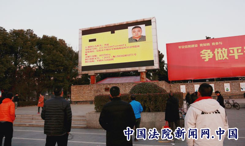 中国法院新闻讯(王雪阳)12月20日傍晚,在平桥区世纪广场东北角LED大屏幕上,20名“老赖”的名单连续滚动播出,过往市民可以清楚地看到他们的照片、姓名、身份证号、住址或单位、欠款金额及失信情况等内容,这是信阳市平桥区人民法院今年来在公共场所第五次晾晒“老赖”信息。