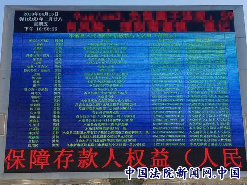 中国法院新闻讯(热依汉古丽)近日,木垒县法院在位于木垒县人民北路和北环东路交界处的电子显示大屏上滚动播出169名“老赖”名单,播放名单中包含被执行人姓名、身份证号、执行标的欠款额和法院举报电话等内容。这些“老赖”欠债最高的达上百万,少的有几千元。该路段是木垒县的核心路段,每天的人流量巨大,名单播出之后,引起了过往群众的围观和评论。