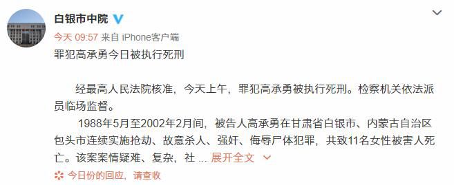 中国法院新闻讯 据白银市中级人民法院官方微博@白银市中院,经最高人民法院核准,今天上午,罪犯高承勇被执行死刑。检察机关依法派员临场监督。