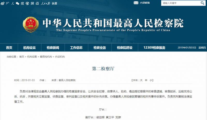 第二检察厅:负责办理危害国家安全、公共安全犯罪,故意杀人、抢劫、毒品等犯罪案件的审查逮捕、审查起诉、出庭支持公诉、抗诉,开展相关立案监督、侦查监督、审判监督以及相关案件的补充侦查。办理最高检管辖的相关刑事申诉案件。负责死刑复核法律监督工作。第二检察厅厅长: 副厅长:侯亚辉 黄卫平 刘彦。