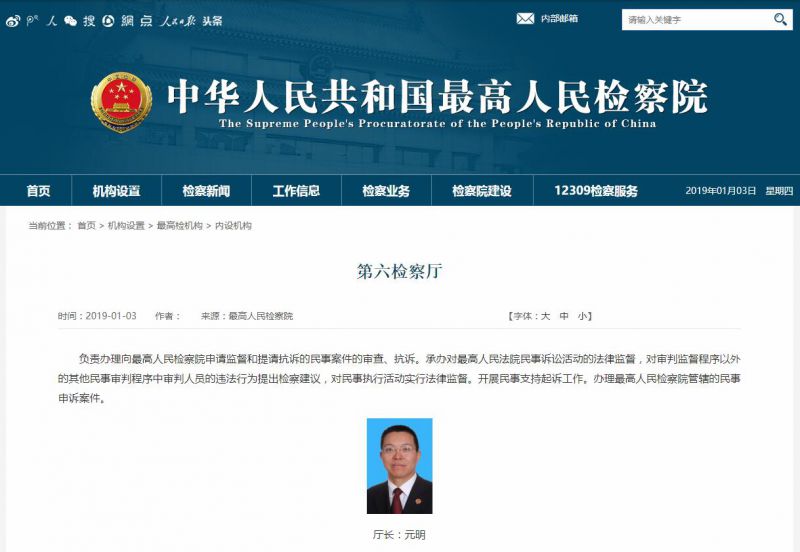 第六检察厅,负责办理向最高检申请监督和提请抗诉的民事案件的审查、抗诉。承办对最高法民事诉讼活动的法律监督,对审判监督程序以外的其他民事审判程序中审判人员的违法行为提出检察建议,对民事执行活动实行法律监督。开展民事支持起诉工作。办理最高检管辖的民事申诉案件。厅长:元明,副厅长:贾小刚 吕洪涛。