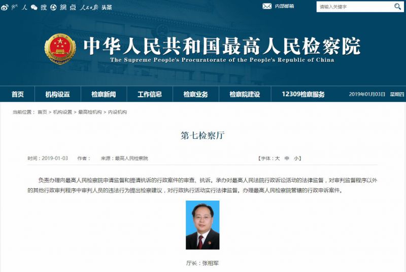 第七检察厅,负责办理向最高检申请监督和提请抗诉的行政案件的审查、抗诉。承办对最高法行政诉讼活动的法律监督,对审判监督程序以外的其他行政审判程序中审判人员的违法行为提出检察建议,对行政执行活动实行法律监督。办理最高检管辖的行政申诉案件。第七检察厅厅长:张相军,副厅长:张步洪。