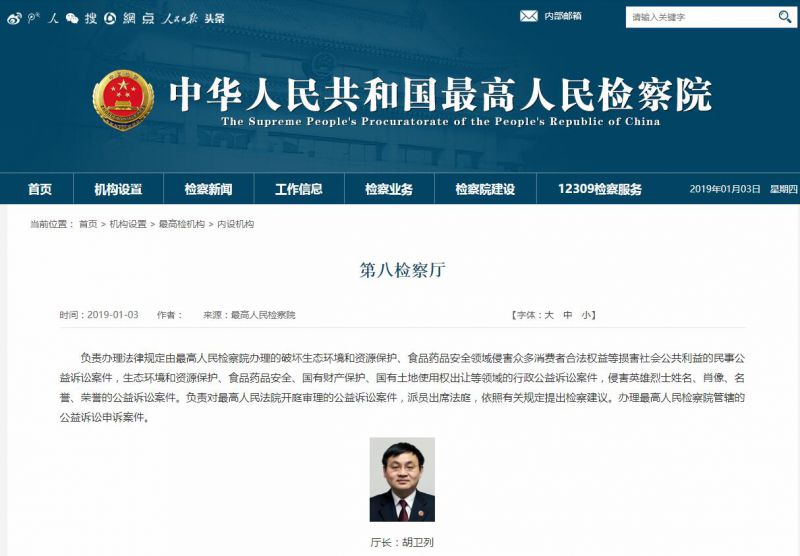 第八检察厅,负责办理破坏生态环境和资源保护、食品药品安全领域侵害众多消费者合法权益等损害社会公共利益的民事公益诉讼案件,生态环境和资源保护、食品药品安全、国有财产保护、国有土地使用权出让等领域的行政公益诉讼案件,侵害英雄烈士姓名、肖像、名誉、荣誉的公益诉讼案件。负责对最高法开庭审理的公益诉讼案件,派员出席法庭,依照有关规定提出检察建议。办理最高检管辖的公益诉讼申诉案件。厅长:胡卫列