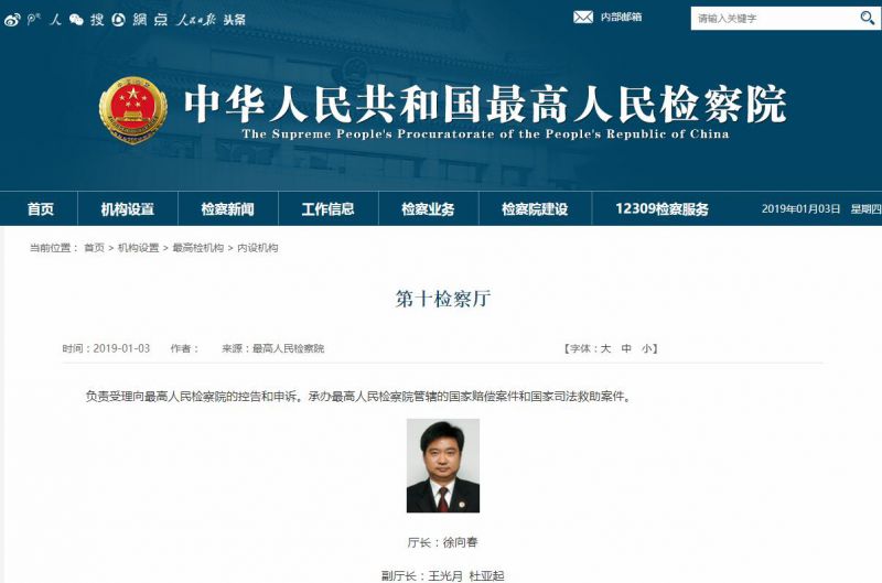 第十检察厅,负责受理向最高检的控告和申诉。承办最高检管辖的国家赔偿案件和国家司法救助案件。第十检察厅厅长:徐向春,副厅长:王光月 杜亚起。